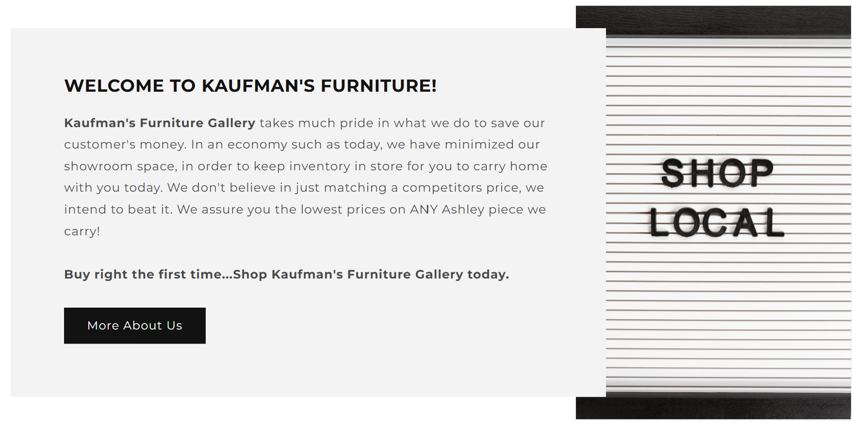 We have furnished most of our home with Kaufman Furniture Galllery years ago. The quality has lasted and our furniture still looks new! We are looking to update our living room, we live in Atlanta. However, we will go online and order from Kaufmans!! The service is EXCELLENT and the product quality and price are unsurpassed!