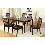 Enjoy entertaining guests in the simple elegance of this transitional dining table and leatherette chairs. Each chair has a padded brown leatherette seat and a trellis style back.