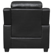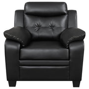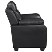 Ease away the stress of the day in this comfortable, versatile armchair. With thickly padded armrests and a plush, supportive headrest, it offers hours of cozy relaxation. Available in a variety of colors, its smooth, leather-like upholstery gives it a sumptuous look and feel. Its back is accentuated by subtle tufted stitching, adding a hint of classic glamour to its tasteful design. Paired with a matching sofa and loveseat, this chair pulls a room together in stylish harmony. Key Features: • Stylish stationary sofa collection • Perfect for small spaces • Soft, breathable, black leatherette upholstery • Ultra-plush headrest and armrests • Subtle tufting on backrests for added style • Durable kiln dried hardwood frame