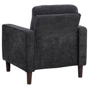 This modern accent chair brings cozy scale and crisp structure to any compact space. Wrapped in soft, textured upholstery, it features slim track arms with cord welt trim and a grid-tufted back for tailored charm. A pocket coil seat offers long-lasting comfort, while tapered round legs provide a stable, elevated base. Perfectly sized for apartments, bedrooms, or reading nooks, this chair delivers a refined yet inviting presence. Key Features: • Accent chair with slim track arms and tailored grid-tufted back cushion for refined comfort • Rust upholstery adds soft texture and a modern neutral tone for any small space • Cord welt trim outlines the frame and seat with crisp, polished detail • Pocket coil seat construction offers firm support and enduring comfort • Soft polyester fabric is smooth to the touch and easy to care for in daily use • Tapered round legs deliver lifted stability and a sleek, mid-century inspired look
