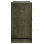 Add a touch of elegance to your bedroom with this spacious dresser, featuring a transitional design with rounded corners and trending details. The dark cocoa finish and brass knobs complement the sophisticated style, while the solid wood drawer box with English dovetail joinery ensures durability. The dresser includes felt-lined top drawers and 45mm metal ball-bearing glides for smooth functionality. Crafted from solid hardwood, ash veneer, and MDF, this dresser combines style and practicality.