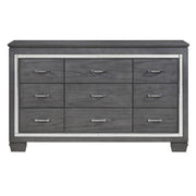 Glamour reigns in the design of the Allura Collection. Framing the dresser is a decorative beveled mirror accent that enhances the illumination from the under-light of the nightstand. High polished crystal-enhanced hardware boldly accents the gray finish .