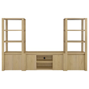 Clean lines and a calming finish define this two-door TV stand, where function meets refined simplicity. The open center shelves are perfect for consoles or display, while each door opens to reveal an adjustable shelf for tailored storage. Discreet cord access at the back keeps your setup neat and clutter-free. Crafted from engineered wood with a scratch-resistant and eco-friendly laminate veneer, its light oak finish brings an airy, organic warmth to your living room or media space. Key Features: • TV stand with open shelving and two hidden compartments in a light oak woodgrain finish • Light oak surface delivers natural warmth with a clean-lined, contemporary presence • Two center shelves are ideal for media players, décor, or everyday tech essentials • Each cabinet door conceals an adjustable shelf for flexible, enclosed storage • Rear cord cutouts offer easy wire management and support up to 65 inch TVs • Crafted from engineered wood, melamine paper, honeycomb board, and laminate veneer
