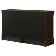 Polish up a traditional decor scheme with this six-drawer dresser, featuring simple and elongated details. Add extra dimension with an exposed wood grain in a warm cappuccino finish. Sleek and simple, radiate classic style and sophistication with the contrast between the deep hue of the wood and nickel bail drawer handles. Crafted from wood veneer and select hardwoods, the silhouette highlights a slightly exposed wood grain. Store clothes in style with the dovetail drawer construction.