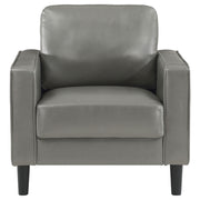 Take a no-fuss approach to your living room decor with the coordinated sophistication of a modern three-piece sofa set that includes a sofa, loveseat, and armchair. Each piece is defined with a structured silhouette and square track arms. Its simple, refined look includes smooth faux leather upholstery, offering a pleasing seating experience with plush cushions. Each piece sits on straight, tapering legs that create a touch of height for an airy, modern look and feel in your living room. Seating is supported with sinuous springs and webbed decking add support behind attached back cushions for optimal comfort.
