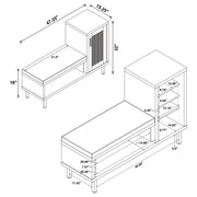 Elevate your entryway with this multifunctional shoe storage bench, elegantly merging form and function. Its engineered wood frame is finished with a durable natural oak colored wood-look laminate veneer, while a black faux leather cushion, foam-padded for comfort, tops the seating area. On one side, a cane-style metal panel door opens to reveal four tiers of shelving, neatly organizing your footwear. Supported by black powder-coated metal legs, this versatile piece delivers both style and practicality in one refined package. Key Features: • A multifunctional shoe storage bench in natural oak finish with integrated seating • Black faux leather upholstered cushion for plush comfort • Cane-style metal door panel concealing four tiers of shoe shelves • Engineered wood construction with a protective laminate veneer • Sturdy black powder-coated metal legs ensure stability and durability • Perfect for maintaining a tidy, welcoming entryway or hallway