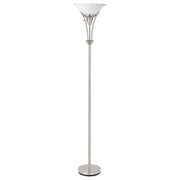 Brighten your home with the ethereal glow of this torchiere lamp, a vision of ambient lighting that radiates timeless elegance. Its frosted shade diffuses a soft, uplifting glow, creating a serene atmosphere in any space. Perfect for modern interiors, this floor lamp stands tall as an up light masterpiece, blending sleek design with functional beauty. Whether casting light on a quiet evening or enhancing a cozy nook, this piece brings a touch of refined sophistication to every moment. Key Features: • Torchiere floor lamp with a frosted shade for soft and elegant up light illumination • Brushed steel finish for a sleek, modern, and sophisticated aesthetic • Up light design casts a warm, diffused glow to enhance any living space • Perfect for ambient lighting in living rooms, bedrooms, or cozy corners • Crafted from heavy gauge metal for lasting durability and sturdy support • Features a convenient foot switch for effortless and seamless operation