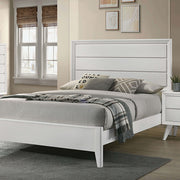 This modern bedroom group sets itself apart through simple design with a few delightful twists. It starts with the clean white finish--a classic element that thrives when paired with subtle yet impactful details. Look closely and you'll notice the wave texture found on the headboard, footboard, and front panels of each of the matching case goods, beautifully framed by moldings with mitered angles. Finally, angled legs and gorgeous lines add contemporary flair to this ensemble's sleek silhouette.
