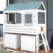 Take playtime to a whole new level with this house-inspired bed and its lovely white finish. Light blue trim accentuates the plank style panels, large windows and roof top to provide an authentic experience that kids will have an absolute blast with. Angled ladder on the side offers access to the twin size bed, while up to two optional matching chests may be accommodated beneath the loft design.
