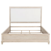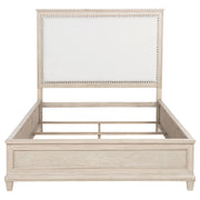 A quiet invitation to rest, this panel bed evokes the calm of coastal mornings and the grace of timeless design. Its tall headboard, wrapped in creamy fabric and framed by washed oak, offers a gentle contrast of texture and tone. A delicate row of nailhead trim glimmers like a finishing touch, while raised panel detailing at the footboard adds poised refinement. Crafted with care from oak veneer, poplar, and soft upholstery, this bed brings serenity and structure to the heart of the bedroom. Key Features: • Queen panel bed with cream upholstered headboard and tailored nailhead trim • Washed oak frame brings soft wood grain texture and coastal-inspired warmth • Tall headboard design adds graceful height and timeless visual impact • Raised panel footboard enhances structure with classic architectural detail • Requires foundation beneath mattress for complete support • Crafted from poplar, engineered wood, oak veneer, and fabric for lasting elegance