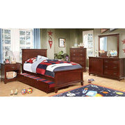 This great-looking bedroom set is perfect for a young child. The bed's simple design and the matching case goods’ straight lines add to the beauty of the set. The dresser has a unique sliding door, while matching trundles and drawers are also available. Cherry and white finish are two options.