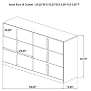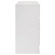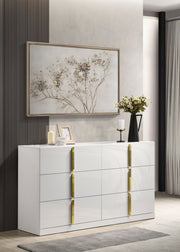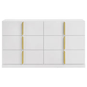 Clean and structured, this six-drawer dresser draws from Italian contemporary style to deliver bold presence and refined function. Finished in white high gloss PET thermoplastic, it offers a scratch-resistant, moisture-resistant surface that is both durable and eco-friendly. Vertically mounted polished gold pulls create a sculptural centerline across six smooth-gliding drawers, combining sleek storage with standout design. Key Features: • Six-drawer dresser with bold vertical symmetry and sculptural gold-accented design • Eco-friendly PET thermoplastic finish is durable, scratch-resistant, and easy to clean • Moisture- and heat-resistant PET surface helps prevent warping and fading over time • Polished gold handles offer sleek contrast and vertically mounted visual structure • Drawers feature English dovetail joinery and smooth operating metal glides • Crafted from engineered wood and includes a tip-over restraint for added safety