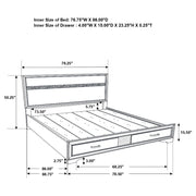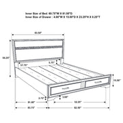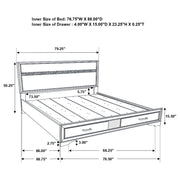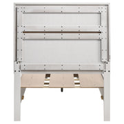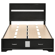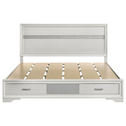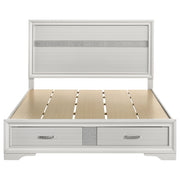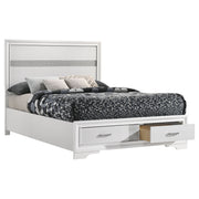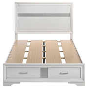 This alluring bed from the Miranda collection has both fashion and function. It features crisp lines and a headboard that's as simple as it is impressive. The footboard is built with two roomy drawers to hold extra sheets and blankets. The bed has an effortless timelessness and elegance. Add to the bedroom for a charming ambiance that's sure to please. Key Features: • Storage panel bed with integrated drawers in footboard design • Fully slatted platform eliminates need for separate foundation • Crystal-accent drawer pulls enhance the glamorous styling • Glitter trim accent at headboard and footboard adds visual interest • Bracket-style feet and beveled framing for a classic profile • Crafted with engineered wood in a bright white laminate finish