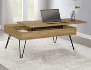 This rectangular coffee table delivers both style and functionality. The lift-top design provides hidden storage, making it perfect for decluttering living spaces. Crafted from engineered wood with a scratch-resistant, eco-friendly laminate veneer in a golden oak finish, it is built to last. Black hairpin legs add a modern industrial vibe, while the spacious tabletop offers ample space for entertaining or everyday needs. Key Features: • Rectangular coffee table with a lift-top mechanism for storage • Engineered wood and eco-friendly laminate veneer for lasting quality • Golden oak finish creates a warm and inviting aesthetic • Sleek black hairpin legs add an industrial-inspired touch • Spacious tabletop perfect for entertaining or daily activities • Sturdy construction ensures reliability for long-term use