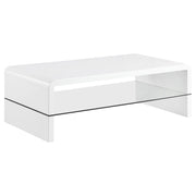 This ultra-modern coffee table showcases a sleek, high-gloss white finish and clean lines. Its rectangular tabletop flows seamlessly into waterfall edges, creating a contemporary silhouette. A clear tempered glass shelf offers an airy, open feel while providing functional storage. Perfect for displaying books or decor, this table brings an art studio-inspired aesthetic to your space. Engineered wood construction ensures durability, while its polished look elevates any living area with modern sophistication. Key Features: • Coffee table with ultra-modern, rectangular waterfall design • High-gloss white finish for a polished, contemporary look • Clear tempered glass shelf adds storage with an open, airy feel • Engineered wood construction offers long-lasting durability • Perfect for showcasing books and decorative pieces • Creates a sleek, artistic aesthetic for modern living spaces