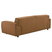 Sleek and sculptural, this leather-upholstered sofa blends minimalist form with elevated comfort. Wrapped in 100% genuine top grain leather, it offers a luxurious hand and timeless presence. Wide track arms and a low-profile frame shape a bold, architectural silhouette, while deep seating and padded back cushions provide an inviting place to unwind. Built with sinuous spring support and high-density full foam seating, it delivers lasting comfort wrapped in tailored sophistication. Key Features: • Sofa upholstered in 100% top grain leather for premium texture, durability, and refined comfort • Orange tone adds rich depth and modern character to any living space • Low-profile frame with wide track arms offers sculptural appeal and relaxed style • Deep seat cushions and padded backrests provide supportive lounging • High-density full foam seating ensures consistent comfort and lasting shape retention • Sinuous spring foundation delivers flexible support and balanced weight distribution