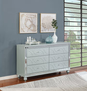 Give your home a modern glam update to classic design with this transitional six-drawer dresser. It features a glitzy design that takes center stage in any modern bedroom. It's fashioned with a vibrant silver metallic finish with fret work detail on the front panels and drawer fronts. The drawers are adorned with crystal-like pulls and the top ones are lined with black felt. Delicate bun feet complete the design of this exquisite showpiece dresser. Key Features: • Six-drawer dresser with silver metallic frame and mirrored trim • Fretwork panel overlays and crystal drawer pulls enhance glam styling • Top drawers are felt-lined to store watches, jewelry, or eyewear • Smooth-gliding drawers with clear sealer interior finish for convenience • Turned bun feet elevate the profile with traditional design elements • Engineered wood build with mirrored and polyresin detailing