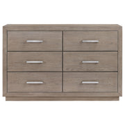Enjoy the roomy storage and understated character of a modern six-drawer dresser. It's a fresh, understated design that showcases a wide top and recessed base that pair to deliver a timeless look. The dresser shows off wood grain details in a neutral barley brown finish, delivering stylish flair that complements in any setting. Each drawer is equally sized for easy storage and organization. Chrome finish bar pulls add a touch of contrast and textural appeal. Key Features: • Augment your bedroom with the easy, stylish storage featured in this modern six-drawer dresser • Barley brown finish is soft and neutral, offering a fresh palette for the decor of your choice • Six drawers of equal size provide ample storage for clothing, accessories and linens • Mitered trim adds dimension while chrome finish bar pulls complete the look • Recessed base lightens the look while a wide top is ideal for personal decor
