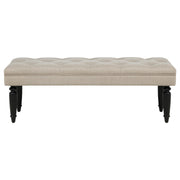Traditional grace meets modern versatility in this upholstered accent bench. A softly tailored seat with button tufting lends texture and charm, while turned wooden legs offer a grounded elegance. The elongated frame invites moments of pause at the foot of a bed, beside an entryway, or in a quiet corner. With plush cushioning and a gently refined silhouette, this bench blends function and romance for curated spaces that value comfort and form. Key Features: • Accent bench with elongated profile for entryways, living areas, or bedroom seating • Latte fabric upholstery with soft button tufting adds visual depth and texture • Turned wood legs in black finish offer a refined traditional detail to the base • Plush cushioned top provides comfort for seating, styling, or dressing use • Crafted from fabric, foam, engineered wood, solid wood, and reinforced plywood • Neutral tone and classic silhouette integrate well across multiple interior styles