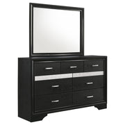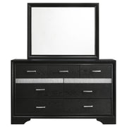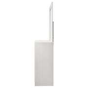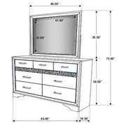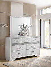 Bring sophisticated grace to your bedroom with this chic dresser, designed to lend an elegant touch to your personal sanctuary. Its felt-lined drawers offer safekeeping for delicate belongings, while the hidden jewelry drawer provides a discreet space for your treasures. The glittery panel across the front sparkles with opulence, enhancing the dresser's allure. Complementing the piece is the cheerful mirror, whose linear design and framed construction add a stylish ambiance. Choose from various finishes to perfectly round out your bedroom's design scheme. Key Features: • Seven-drawer dresser with smooth full-extension glides • Hidden jewelry drawer set behind glitter accent panel • Top drawers are felt-lined for delicate storage • Crystal drawer pulls add sparkle and contrast • Framed mirror with beveled edges complements the dresser • Constructed from engineered wood with white finish