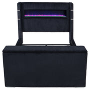 This innovative wingback bed levels up a top-selling design with bold tech upgrades and plush texture. A hidden motorized TV mount rises from the footboard via remote control, supporting screens up to 50 inches and tucking neatly away when not in use. The headboard’s flame visualizer glows over shimmering crystal rocks with sixteen color settings. Dual USB-A and USB-C ports on each side keep devices powered. Upholstered in soft, faux fur-style corduroy over a solid pine frame. Key Features: • Queen wingback bed upgraded with motorized TV lift in footboard and remote-controlled flame box • Plush black faux fur-like corduroy fabric delivers striking, tactile softness and bold style • Hidden footboard TV rack accommodates up to fifty-inch flat screens with smooth lift • Headboard includes crystal flame visualizer with sixteen color options and no heat output • Dual USB-A and USB-C ports on each side of headboard provide fast, convenient charging • Solid pine frame and seven-foot electrical cord ensure reliable structure and easy power access