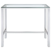 Add a flash of panache to your rec room or home bar with this modern bar table. Contemporarily designed with chrome legs and glass top. Crisp, clean lines cut an incisive silhouette. A martini with an olive or a classic old fashioned both deserve a bar table like this. Calculate your next investment or discuss your impending joint venture in style. Key Features: • Rectangular pub-height bar table with a bold, modern and minimalist aesthetic • Clear tempered glass top offers long-lasting durability and an airy, open feel • Sturdy metal frame in a polished chrome finish enhances sleek contemporary style • Sleek, angular legs provide enhanced stability and a streamlined silhouette • Versatile design complements dining areas, home bars, or loft-inspired interiors • Ideal for casual gatherings or creating a sophisticated and stylish bar space