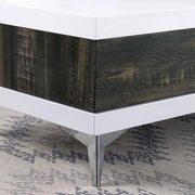 CORINNE Coffee Table, 47 1/4"L X 23 5/8"W X 17"H, 138.4lbs. Retro futuristic design' is a past calculation of what the future would look like. This set was fashioned with that concept in mind. Starting with the shiny chrome dynamically-cut feet that are set at a seemingly-impossible angle, they support the antiseptic rectilinear glossy white blocks that make up the bulk of the tables. The addition of oak panels and drawers provide the warmth of home, needed in even the most sterile of environments. Oddly enough, they also supply the most innovative of features, with their uniquely hidden storage capability. Collectively these features create a stunning visual that will be of pleasant surprise to any visitor.