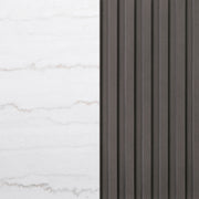 Center your living space with this elegant, modern round coffee table. The genuine white marble top exudes sophistication with its subtle veining, adding organic flair. The clean, light coloration complements any surrounding decor. A ribbed, engineered wood frame in a charcoal finish creates texture and depth, while the brushed gold metal base brings a luxurious touch. This piece seamlessly blends refined materials and design, making it the perfect addition to your living room.
