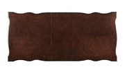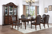 The most festive occasions deserve the most stylish furniture! Enjoy great food and company over this elegant formal dining table, which expands with a 20-inch leaf to accommodate even more guests. Finished in brown cherry, the set's rich details include decorative faux wood carvings on the apron and legs reminiscent of baroque styling. The matching chairs feature button-tufted leathered in espresso, with the dramatic buffet and hutch has tempered glass doors and multiple shelves and drawers to store china and silverware.