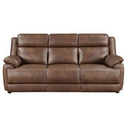 Dive into stylish relaxation with a transitional three-piece sofa set. Including a sofa, loveseat, and armchair, the set creates an inviting tone in your living room. Extra-plush foam cushions and pocket coil seating provide utmost support, great for everything from lounging to entertaining friends and family. Each piece features a relaxed stance complete with dark brown faux leather upholstery that's smooth and supple. Pillowtop arms add inviting comfort you're going to love.