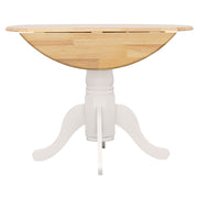 Bring cozy charm to your dining area with this round drop leaf dining table. Designed with a smooth tabletop and sturdy pedestal base, it combines traditional craftsmanship with functional versatility. The drop-leaf design allows you to expand or reduce the surface space as needed, perfect for compact dining areas or breakfast nooks. Elegant curved legs add a touch of sophistication, while the contrasting natural wood top and white base create a bright, welcoming two-tone look for everyday gatherings. Key Features: • Dining table features a classic round drop-leaf top for versatile seating • Crafted from solid rubberwood for dependable everyday durability • Smooth two-tone finish with a natural top and crisp white base • Elegant turned pedestal design adds timeless farmhouse appeal • Four curved legs provide balanced support and visual refinement • Perfect size for small dining spaces, kitchens, or breakfast nooks