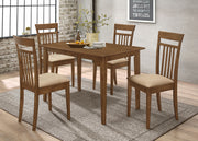 Bring casual sophistication to your dining area with this five-piece dining set. The rectangular table features clean lines and tapered legs, offering a timeless look that complements transitional spaces. Each chair showcases a classic slatted back design for added support and style. Plush cushioned seats upholstered in soft beige microfiber enhance comfort. Crafted from solid rubberwood, engineered wood, and okume veneer, this dining set provides lasting beauty for everyday dining. Key Features: • Dining set includes rectangular table and four mission style dining chairs • Crafted of rubberwood, engineered wood, and okume veneer for strength • Warm chestnut finish enhances the natural texture of the wood grain • Mission style chairs feature slatted backs with supportive contours • Soft beige padded seats upholstered in microfiber for lasting comfort • Square tapered legs offer balance and stability to the timeless design