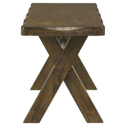 This fine 6-piece dining set that is highlighted by a rectangular table accompanied by four side chairs and a bench. Both the bench and table are constructed from solid Asian wood with a Knotty Nutmeg finish. Each also features a trestle-style base and crisscrossing legs for a sleek design. Side chairs come with slatted backs and lighter-colored upholstered fabric seat cushions. This impressive rustic-style set is sure to be the scene of great stories shared over delicious meals.