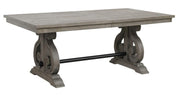 Bold curves provide elegant contrast to the unique look of the Toulon Collection. The heavily scrolled base supports of the table feature routing with dark pewter-finished metal trestle that connects. Distressed dark oak finish provides texture to the acacia veneer of the table.?