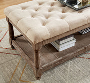 Tanya Beige Bench, 48"L X 15 3/4"W 18 1/2"H, 66.22lbs. The perfect bench for a living room or an entryway where you want to make a quick stop. The worn wood look adds that touch of country charm, like a nice place to kick o Features: Button Tufted Seat Open Bottom Shelf