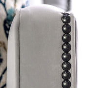 MONTECELIO Loveseat, 64"L X 39"W X 38"H (SEAT HT: 19", SEAT DP: 25"), 110lbs. Enjoy a wonderful, relaxing day on this transitional-style American-built sofa! Dark wooden legs support the piece, while the individual nailheads add an air of luxury. The one piece bench-style back cushion is attached to the frame, and in front are accent pillows with beautiful pops of navy striped and floral patterns. Soft to the touch, the velvet-like fabric wraps around the piece in an inviting, warm light gray color.