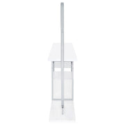 Transform your space into a beacon of style with this contemporary home bar that marries function with cutting-edge design. Bathed in the glow of LED lighting with a choice of eight vibrant colors, this piece becomes the centerpiece of any entertainer's haven. The sleek chrome electroplated metal frame supports a durable composite wood tabletop, perfect for hosting an array of glasses and spirits. Below, a two-door cabinet conceals essentials, while three tiers cradle up to 21 bottles of your finest wine. With a built-in stemware rack, this bar doesn't just store your collection, it showcases it, making every occasion a toast-worthy affair.