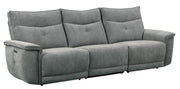 Providing ample seating in modern form the Tesoro Collection. The classic sofa is book-ended by USB port enhanced end power recliners ā allowing for maximum versatility when planning the layout of your living room. Dark gray fabric provides a neutral palette for your decorative preferences. The power reclining mechanism of the reclining ends and armless chair brings you to your desired position with a touch of the button.