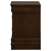 Honor classic simplicity with this two-drawer nightstand. Slightly tapered legs add dimension that balances the tapering of the top of the silhouette. A rich cappuccino finish creates a warm and welcoming effect. Constructed of wood veneer and select hardwoods, this nightstand looks great topped with candles or flowers. Bright metallic hardware creates a contrast against the deep, traditional hues and silhouette. Key Features: • Two-drawer nightstand with classic, simple design • Features slightly tapered legs and top for a balanced silhouette • Rich cappuccino finish adds warmth and a welcoming feel • Constructed from wood veneer and select hardwoods for durability • Bright metallic hardware contrasts beautifully with the deep, traditional hues