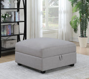 This storage ottoman combines sleek modern design with functional versatility for the living room. Upholstered in soft grey fabric, it features clean lines and a spacious hidden compartment for storing blankets, pillows, or daily essentials. Designed to pair seamlessly with modular sectional components or stand alone as a plush footrest, it offers exceptional flexibility. Feather-down wrapped cushioning and solid wood legs provide lasting comfort and support, blending practicality with refined contemporary style. Key Features: • Modern storage ottoman in soft grey fabric combines sleek form with everyday function • Hidden compartment offers space for blankets, pillows, or daily living essentials • Plush feather-down wrapped cushioning provides comfort and inviting softness • Clean silhouette complements both modular sectionals and standalone arrangements • Crafted with solid wood legs and a reinforced frame for durable long-term use • Versatile as a footrest, extra seat, or modular extension within a living room setup