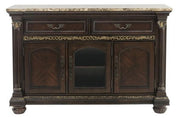 Blending the classic aesthetic of traditional design is the Russian Hill Collection.?The nod to Old World styling comes in elements such as dental, rope and bead molding, shell motifs and faux marble accent, this dining collection goes above and beyond to create the desired look. The server features faux marble top, glass and wood door fronts, wine storage as well as service drawers.?Further lending to the design of the server are the fixed antique finished hardware and pilaster accenting in the style of Corinthian columns.