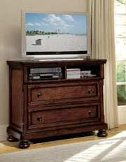 A classic addition to your transitional bedroom will be the Cumberland Collection. Traditional accents such as, the bun feet that support the TV chest and rich brown cherry finish on birch veneer and selected hardwood, blend with framing and lines that compliment your personal style. Open media storage allows for unrestricted access to your entertainment consoles.