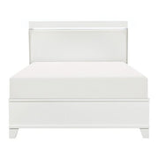 The visually stunning Kerren Collection is a modern study on line and light. LED enhances top rail of the full bed. Providing additional eye-catching drama is the white opalescent faux leather headboard, shimmering in the glow of the LED light.
