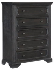 Rustic styling intersects with traditional lines in the design of the Bolingbrook Collection. The charcoal finish over pine solids and engineered pine veneer creates a warm complement to the elegantly framed chest. Knob hardware subtly accents the drawer fronts.