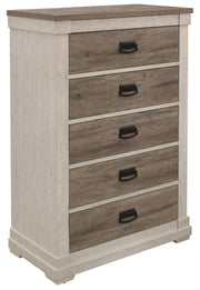 Designed for your transitionally styled bedroom is the Arcadia Collection. The two-tone look of the group is achieved with white framing and variegated gray printed faux-wood grain veneer. Dark hardware lends visual contrast to the classic shape of the chest.