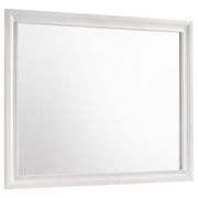 Sparkling diamond-like trim ups the glamour for a five-piece modern bedroom set. Compelling in its elegant simplicity, it centers on an upholstered bed and features a lightly textured white finish paired with smooth white molded trim. A nightstand, dresser with mirror, and chest provide plenty of drawers for easy storage and organization. Stripes of glittering, diamond-like trim and jewel-like bar pulls elevate the set, creating a fresh, sophisticated look and feel for your bedroom. Bracket feet complete the look with a touch of movement.